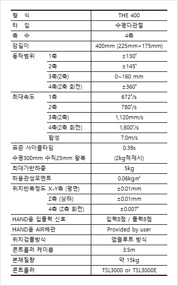 NEW model SCARA ROBOT THE400°í¼Ó, °íÁ¤¹Ð, Á¤È®ÇÑ À̵¿°æ·Î- ÀüÀÚ Àåºñ ¹× ÀÚµ¿Â÷ ºÎǰÀÇ Á¶¸³ ¹× °Ë»ç °øÁ¤ µî ³ôÀº Á¤¹Ðµµ¸¦ ¿ä±¸ÇÏ´Â ÇöÀå¿¡ ÀûÇÕÇÕ´Ï´Ù.- Á¤È®ÇÑ À̵¿ ±ËÀû- °í¼Ó ÀÛµ¿ ¹× ºÎÇÏ ¼º´É Çâ»ó(»çÀÌŬŸÀÓ 0.39ÃÊ (Á¤°Ý 1kg) ÃÖ´ë°¡¹ÝÇÏÁß 5kg, Çã¿ë °ü¼º ¸ð¸àÆ® 0.06kg.§³
